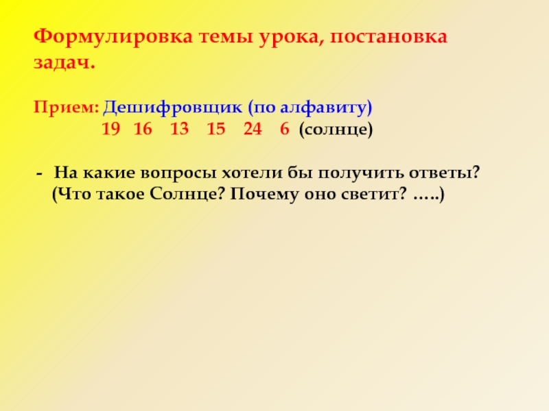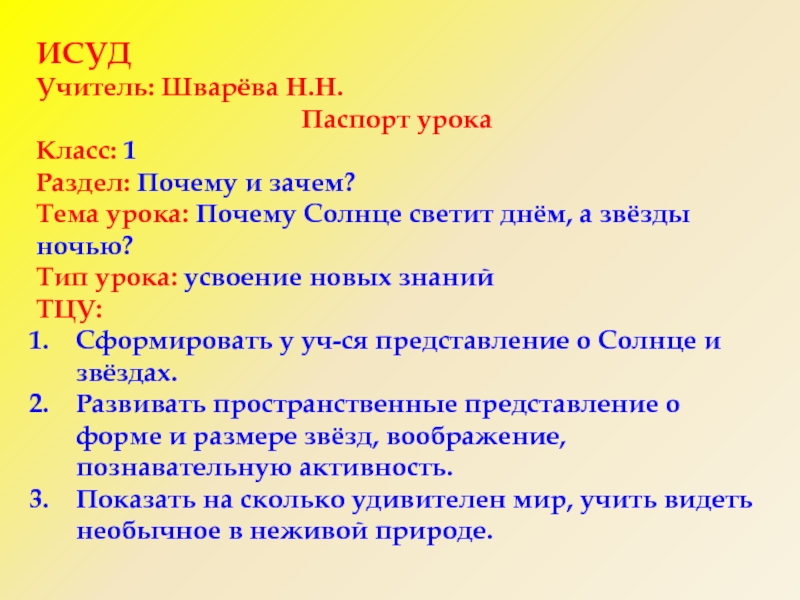 Сформировать у уч-ся представление о Солнце и звёздах.