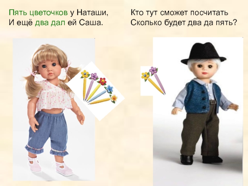 Слайд 23Пять цветочков у Наташи, И ещё два дал ей Саша.