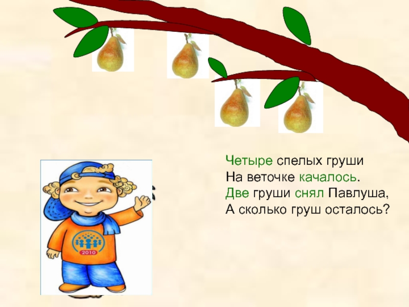 Четыре спелых груши   На веточке качалось.   Две груши снял Павлуша, А сколько груш