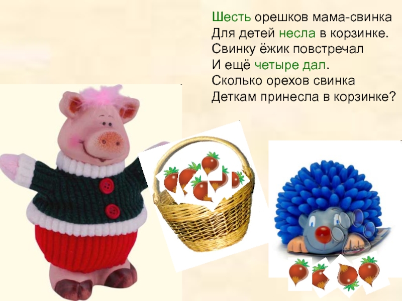 Шесть орешков мама-свинка  Для детей несла в корзинке.  Свинку ёжик повстречал
