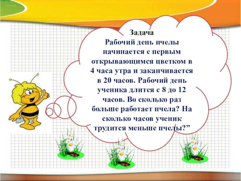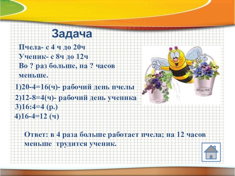 Рабочий день пчелы начинается с первым открывающимся цветком в 4 часа утра и заканчивается в 20 часов. Рабочий день ученика длится с 8 до 12 часов. Во сколько раз больше работает пчела? На сколько часов ученик трудится меньше пчелы?”