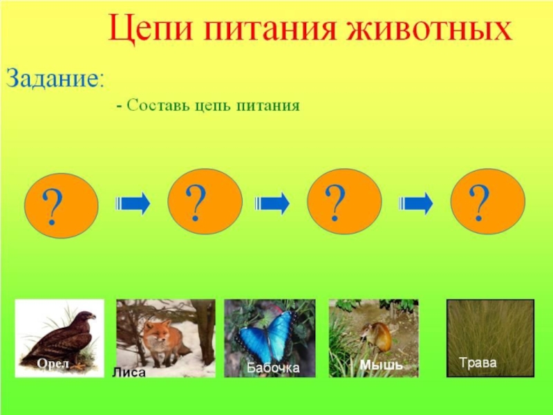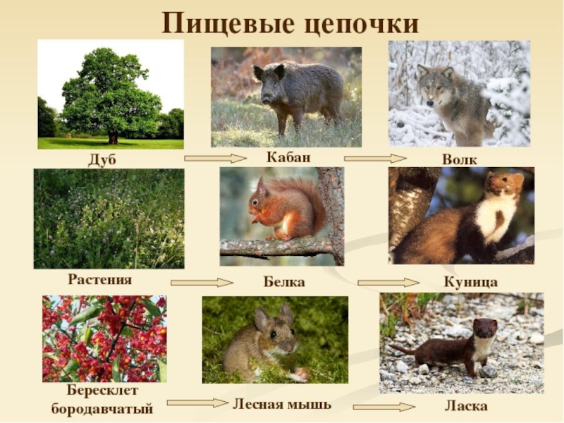 ТРАВА--------КУЗНЕЧИК-----------ЛЯГУШКАКАПУСТА------------ЗАЯЦ--------ЛИСАКУКУРУЗА----------МЫШЬ--------СОВАЖЕЛУДЬ-----------КАБАН-------------ВОЛКВОДОРОСЛИ ---РЫБА----БЕЛЫЙ МЕДВЕДЬ