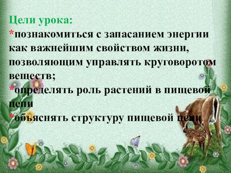 Цели урока: *познакомиться с запасанием энергии как важнейшим свойством жизни, позволяющим управлять круговоротом веществ; *определять роль растений