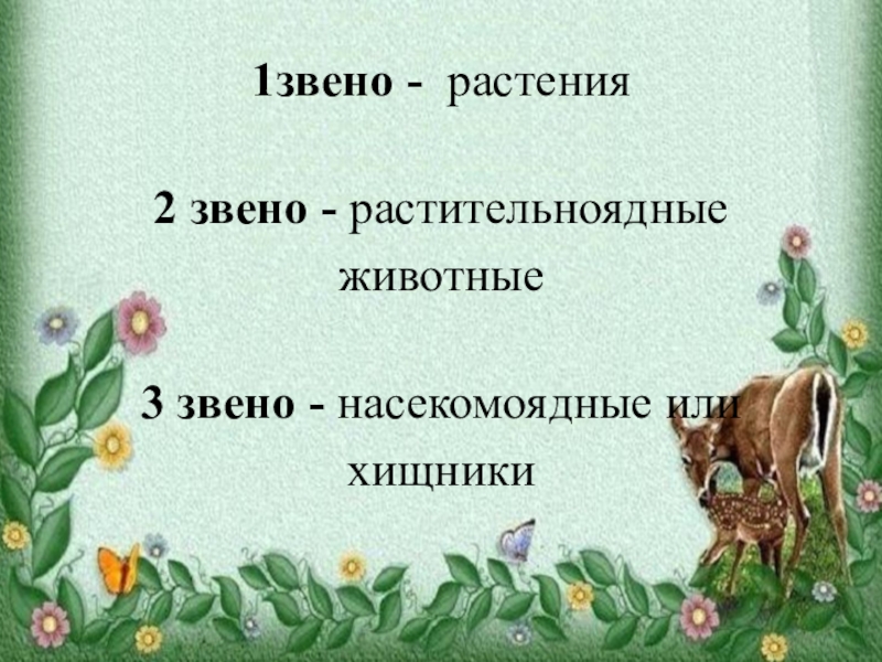 Слайд 191звено -  растения 2 звено - растительноядные животные 3 звено - насекомоядные или хищники