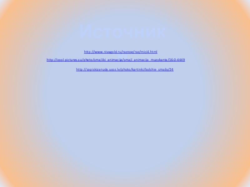 Источники http://www.nivagold.ru/raznoe/raz/mici4.htmlhttp://cool-pictures.su/photo/smajliki_animacija/smajl_animacija_muzykanta/16-0-4449http://zapiskizanudy.ucoz.lv/photo/kartinki/bolshie_smajly/24