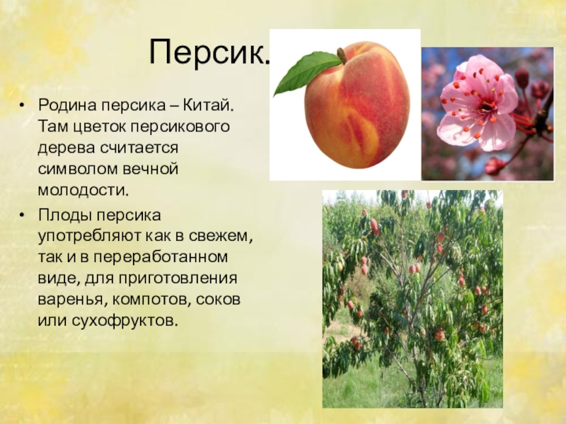 Плоды персика употребляют как в свежем, так и в переработанном виде, для приготовления варенья, компотов, соков или сухофруктов.