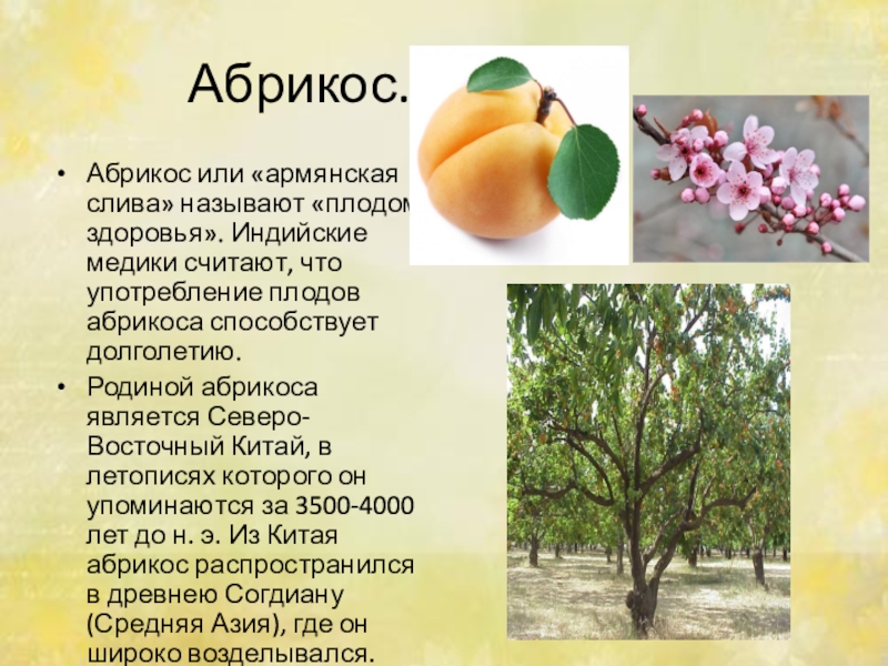 «плодом здоровья». Индийские медики считают, что употребление плодов абрикоса способствует долголетию.