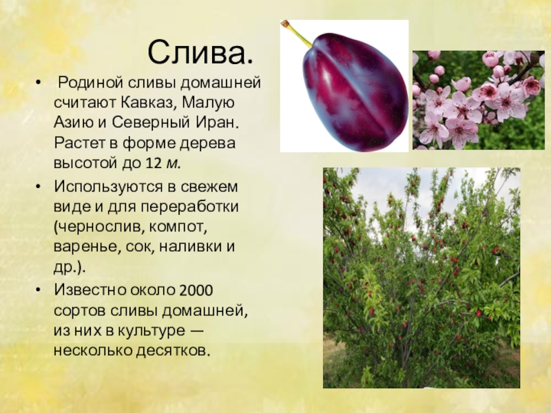 Известно около 2000 сортов сливы домашней, из них в культуре — несколько десятков.
