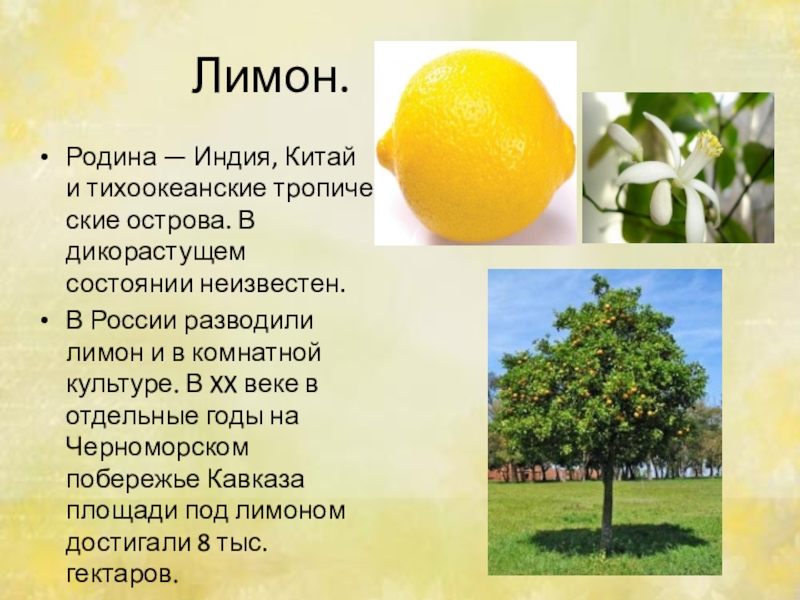 В России разводили лимон и в комнатной культуре. В XX веке в отдельные годы на Черноморском побережье Кавказа площади под лимоном достигали 8 тыс. гектаров.