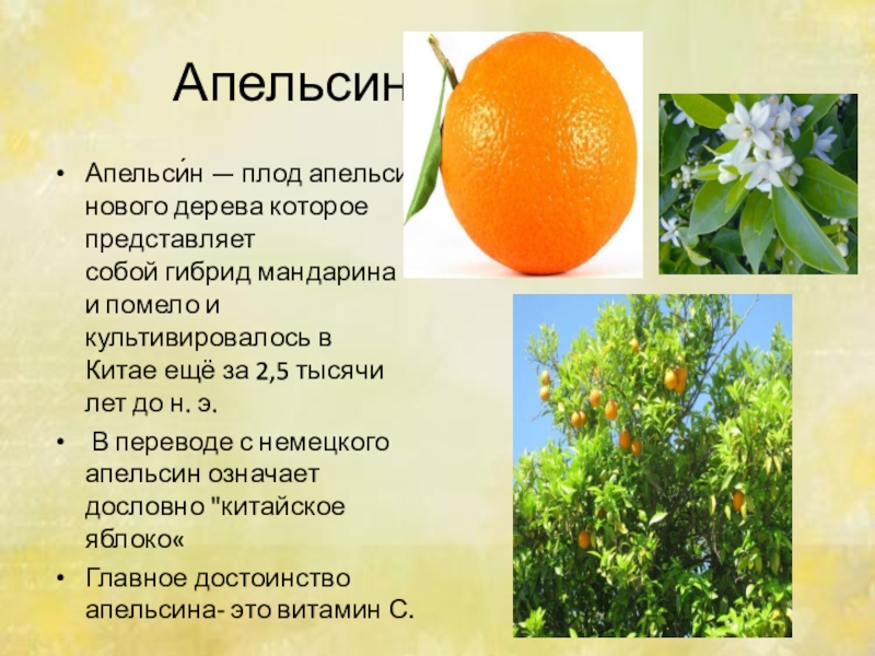Апельси́н — плод апельсинового дерева которое представляет собой гибрид мандарина и помело и
