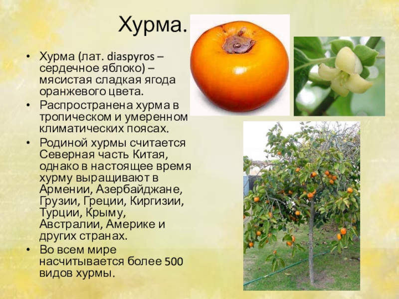 (лат. diaspyros – сердечное яблоко) – мясистая сладкая ягода оранжевого цвета.