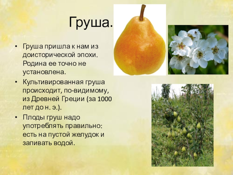 Культивированная груша происходит, по-видимому, из Древней Греции (за 1000 лет до н. э.).