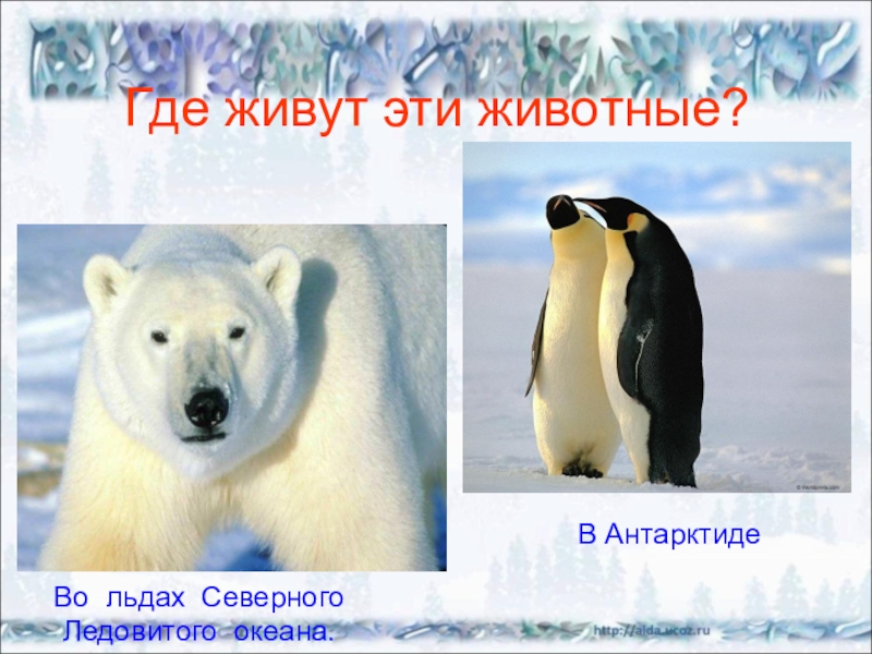 Где живут эти животные?Во льдах Северного Ледовитого океана.В Антарктиде