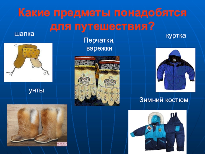 Какие предметы понадобятся для путешествия?шапка курткаПерчатки, варежкиунтыЗимний костюм