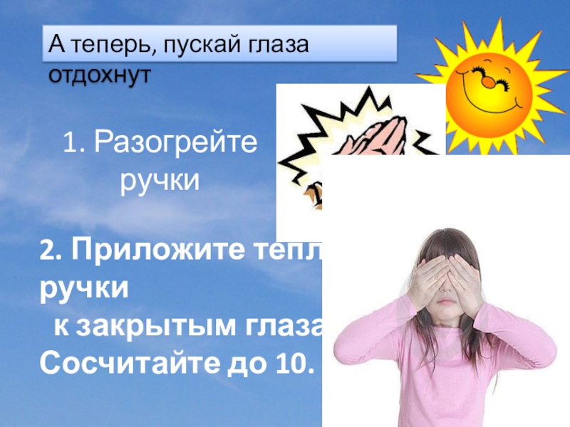 А теперь, пускай глаза отдохнут1. Разогрейте ручки2. Приложите теплые ручки  к закрытым глазам.Сосчитайте до 10.
