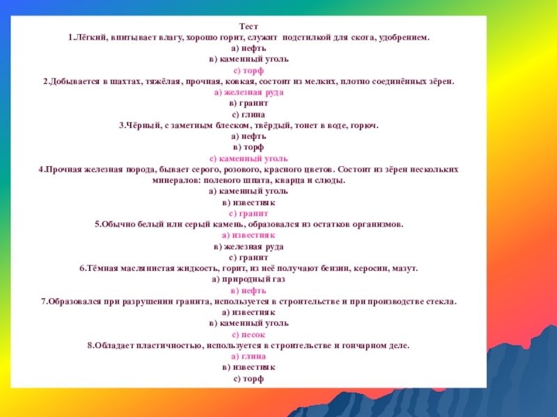 6.Тёмная маслянистая жидкость, горит, из неё получают бензин, керосин, мазут.