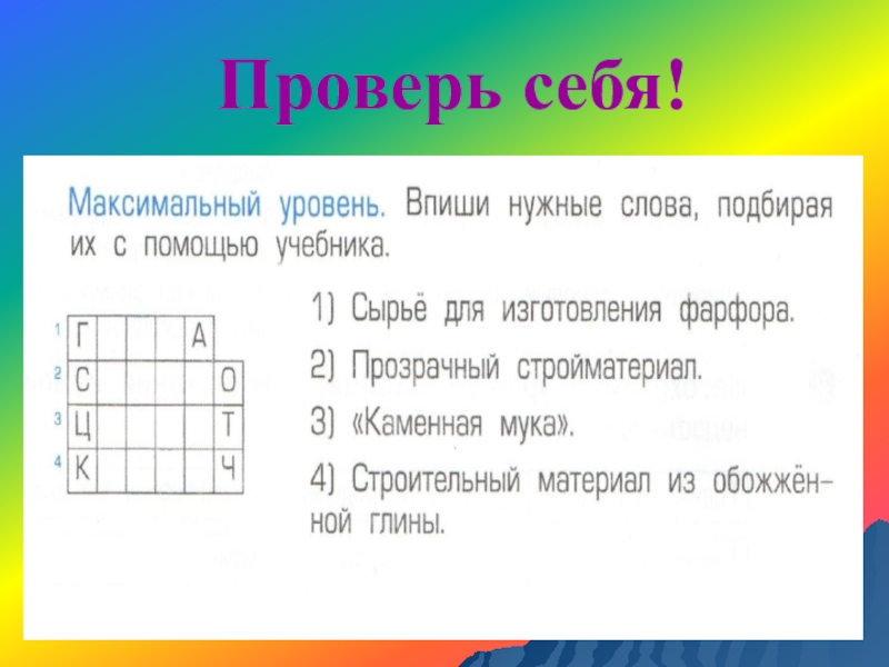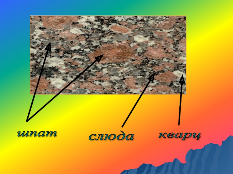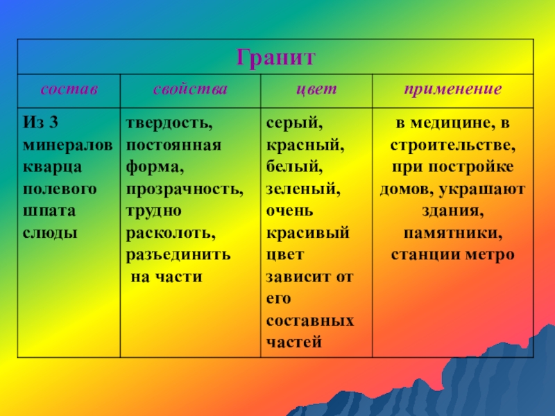 4.Прочная железная порода, бывает серого, розового, красного цветов. Состоит из зёрен нескольких минералов: полевого шпата, кварца и слюды.