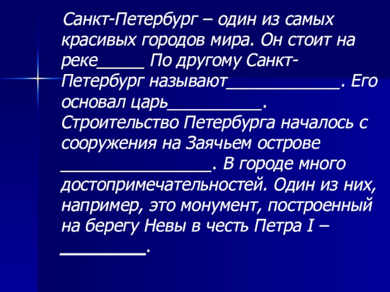 стоит на реке_____ По другому Санкт-Петербург называют____________. Его основал царь__________. Строительство Петербурга началось с сооружения на Заячьем острове ________________. В городе много достопримечательностей. Один из них, например, это монумент, построенный на берегу Невы в честь Петра I – _________.