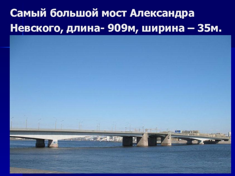 Слайд 40Самый большой мост Александра Невского, длина- 909м, ширина – 35м.