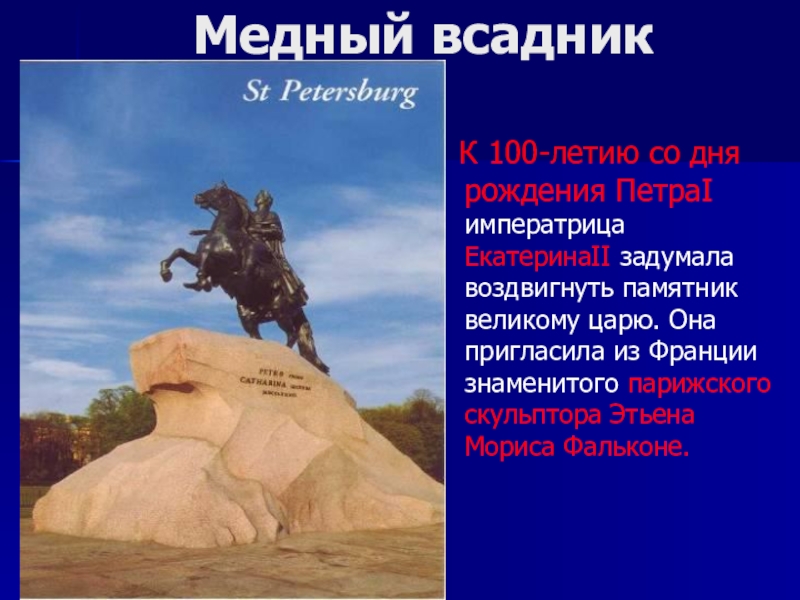 задумала воздвигнуть памятник великому царю. Она пригласила из Франции знаменитого парижского скульптора Этьена Мориса Фальконе.