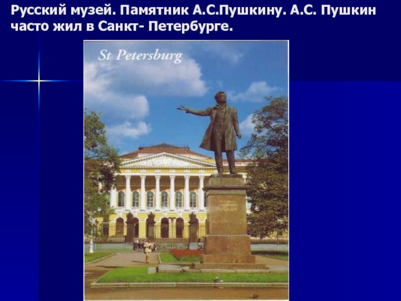 Слайд 50Русский музей. Памятник А.С.Пушкину. А.С. Пушкин часто жил в Санкт- Петербурге.