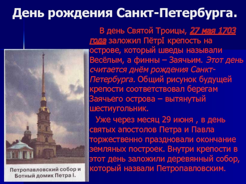 27 мая 1703 года заложил ПётрI крепость на острове, который шведы называли Весёлым, а финны – Заячьим. Этот день считается днём рождения Санкт-Петербурга. Общий рисунок будущей крепости соответствовал берегам Заячьего острова – вытянутый шестиугольник.