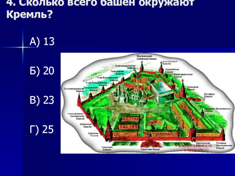 Слайд 84. Сколько всего башен окружают Кремль?