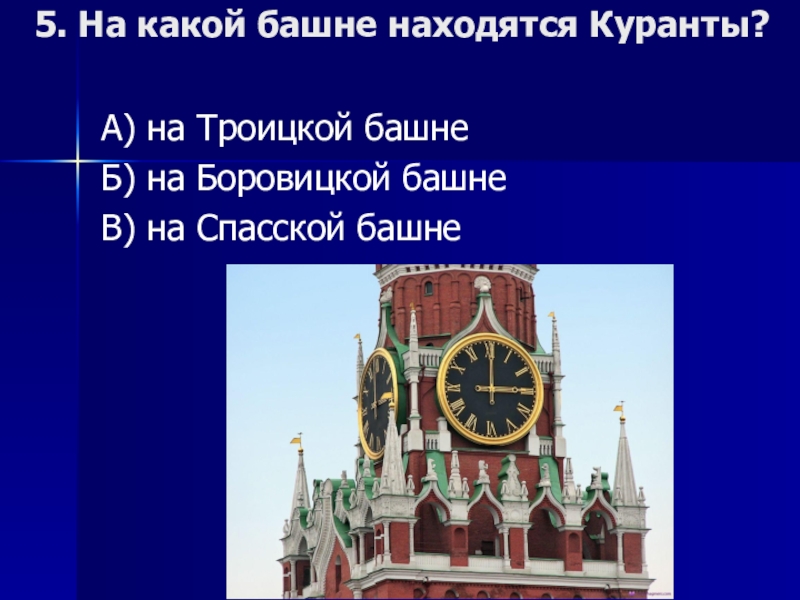 Слайд 95. На какой башне находятся Куранты?