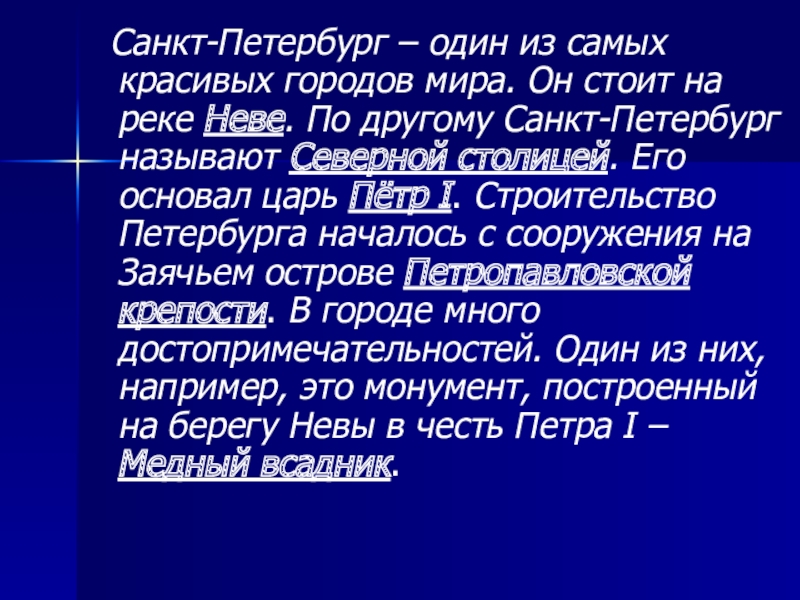 на реке Неве. По другому Санкт-Петербург называют Северной столицей. Его основал царь Пётр I. Строительство Петербурга началось с сооружения на Заячьем острове Петропавловской крепости. В городе много достопримечательностей. Один из них, например, это монумент, построенный на берегу Невы в честь Петра I – Медный всадник.
