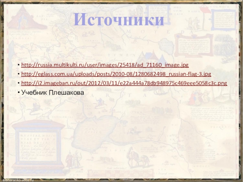 Источникиhttp://russia.multikulti.ru/user/images/25418/ad_71160_image.jpghttp://eglass.com.ua/uploads/posts/2010-08/1280682498_russian-flag-3.jpghttp://i2.imageban.ru/out/2012/03/11/e22a444a78db948975c469eee5058c3c.pngУчебник Плешакова