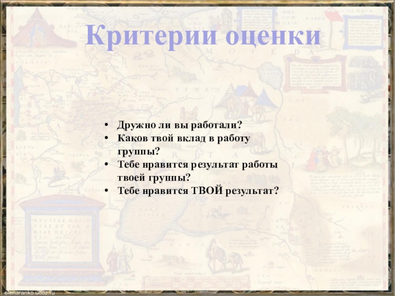 Критерии оценкиДружно ли вы работали? Каков твой вклад в работу группы?Тебе нравится результат работы твоей группы?Тебе нравится