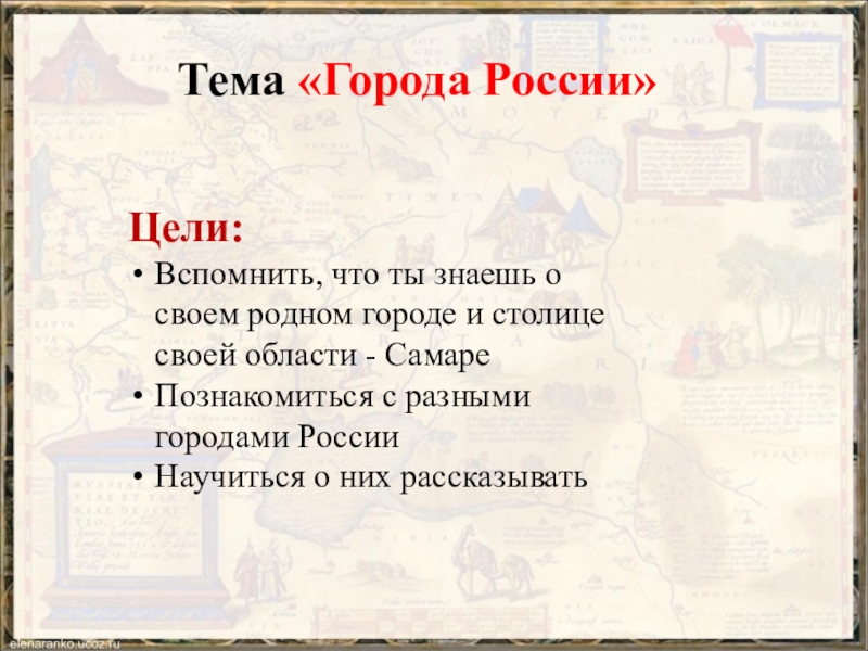 Тема «Города России»Цели:Вспомнить, что ты знаешь о своем родном городе и столице своей области - СамареПознакомиться с