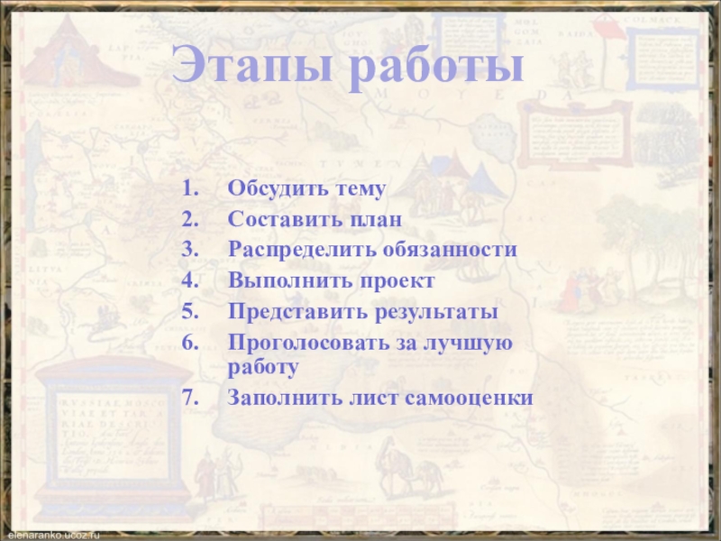 Этапы работыОбсудить темуСоставить планРаспределить обязанностиВыполнить проект Представить результатыПроголосовать за лучшую работуЗаполнить лист самооценки