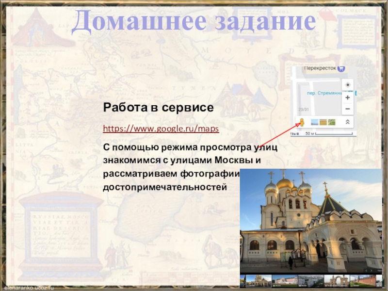 Домашнее заданиеРабота в сервисе https://www.google.ru/mapsС помощью режима просмотра улиц знакомимся с улицами Москвы и рассматриваем фотографии её