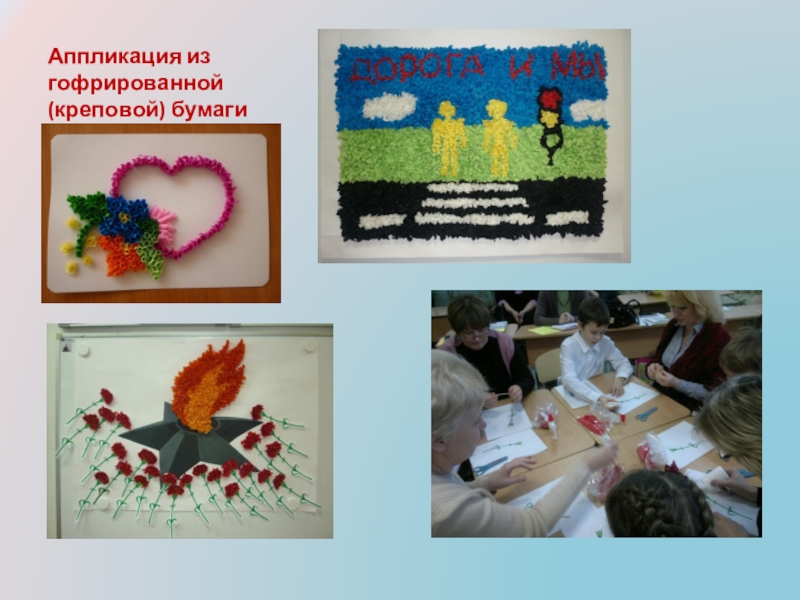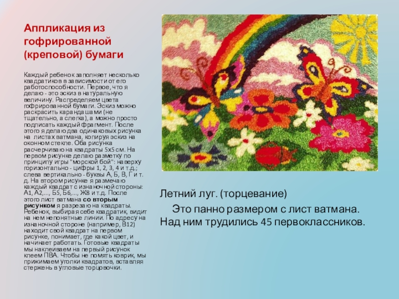 Каждый ребенок заполняет несколько квадратиков в зависимости от его работоспособности. Первое, что я делаю - это эскиз в натуральную величину. Распределяем цвета гофрированной бумаги. Эскиз можно раскрасить карандашами (не тщательно, а слегка), а можно просто подписать каждый фрагмент. После этого я делаю два одинаковых рисунка на листах ватмана, копируя эскиз на оконном стекле. Оба рисунка расчерчиваю на квадраты 5х5 см. На первом рисунке делаю разметку по принципу игры "морской бой": наверху горизонтально - цифры 1, 2, 3, 4 и т.д.; слева вертикально - буквы А, Б, В, Г и т.д. На втором рисунке я размечаю каждый квадрат с изнаночной стороны: А1, А2,..., Б5, Б6,..., Ж8 и т.д. После этого лист ватмана со вторым рисунком я разрезаю на квадраты. Ребенок, выбирая себе квадратик, видит на нем непонятные линии. По адресу на изнаночной стороне (например, В12) находит свой квадрат на первом рисунке, понимает, где какой цвет, и начинает работать. Готовые квадраты мы наклеиваем на первый рисунок клеем ПВА. Чтобы не помять коврик, мы прижимаем уголки квадратов, вставляя стержень в угловые торцовочки.