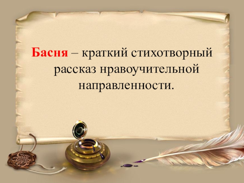 Слайд 4Басня – краткий стихотворный рассказ нравоучительной направленности.