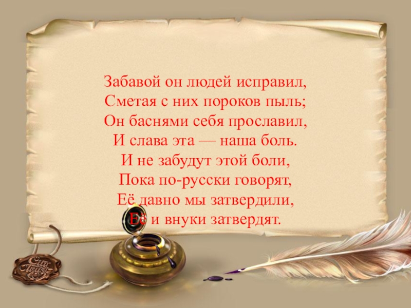 Забавой он людей исправил, Сметая с них пороков пыль;Он баснями себя прославил,И слава эта — наша боль.И не забудут этой боли,Пока по-русски говорят,Её давно мы затвердили,Её и внуки затвердят.