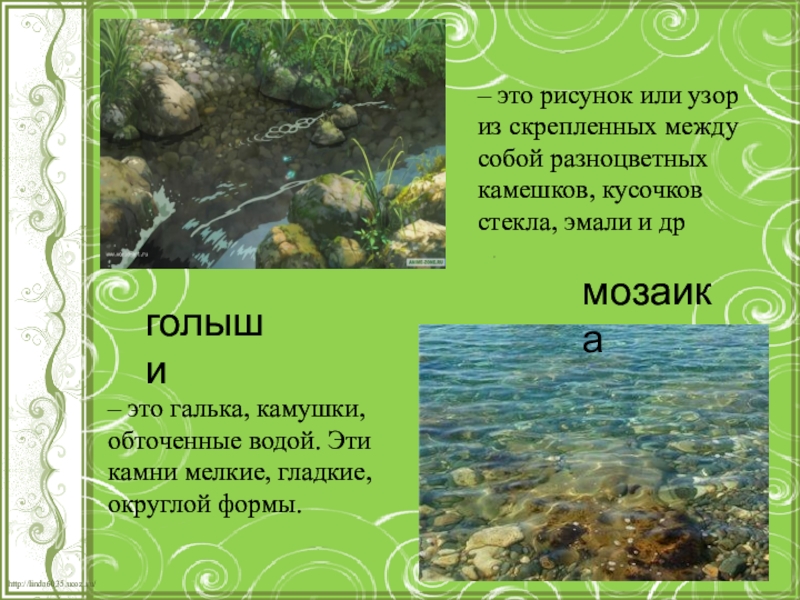 – это рисунок или узор из скрепленных между собой разноцветных камешков, кусочков стекла, эмали и др