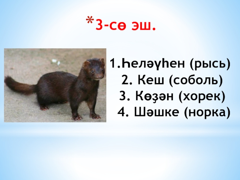 1.Һеләүһен (рысь) 2. Кеш (соболь) 3. Көҙән (хорек) 4. Шәшке (норка)