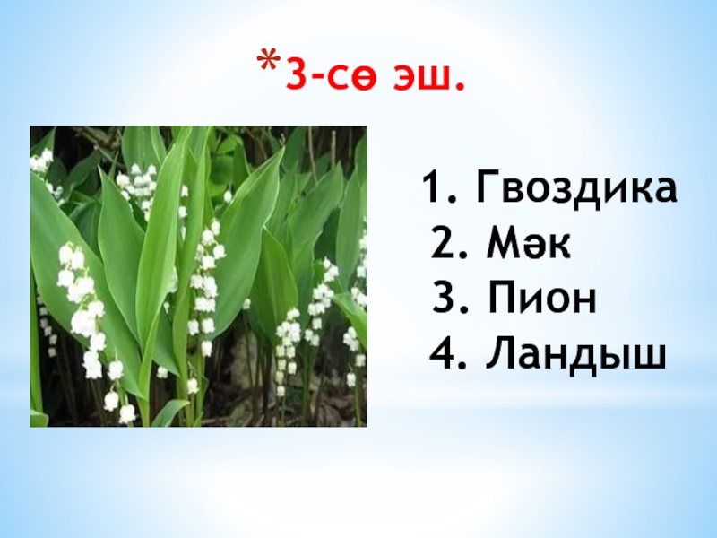 1. Гвоздика 2. Мәк 3. Пион 4. Ландыш