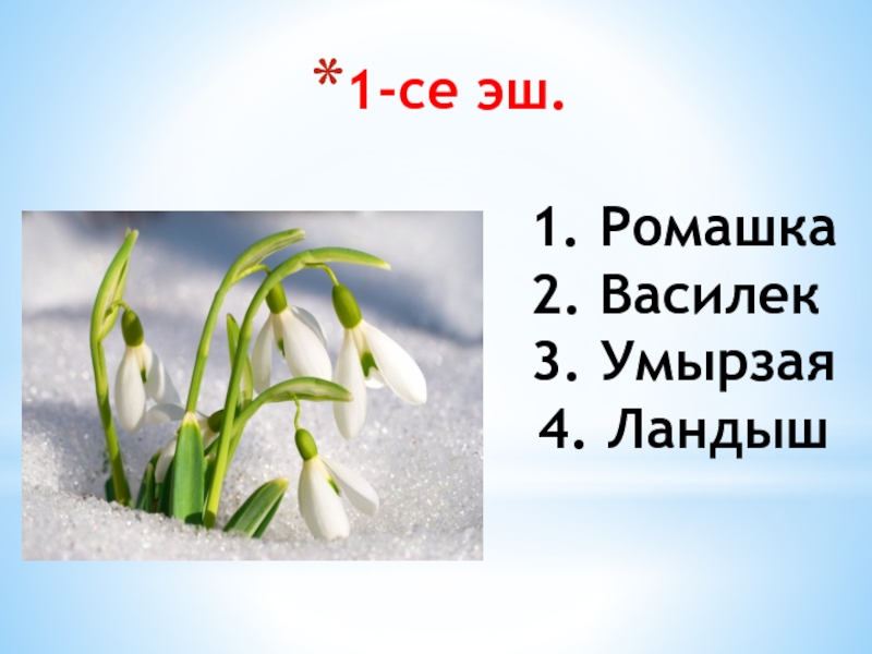 1. Ромашка 2. Василек 3. Умырзая 4. Ландыш
