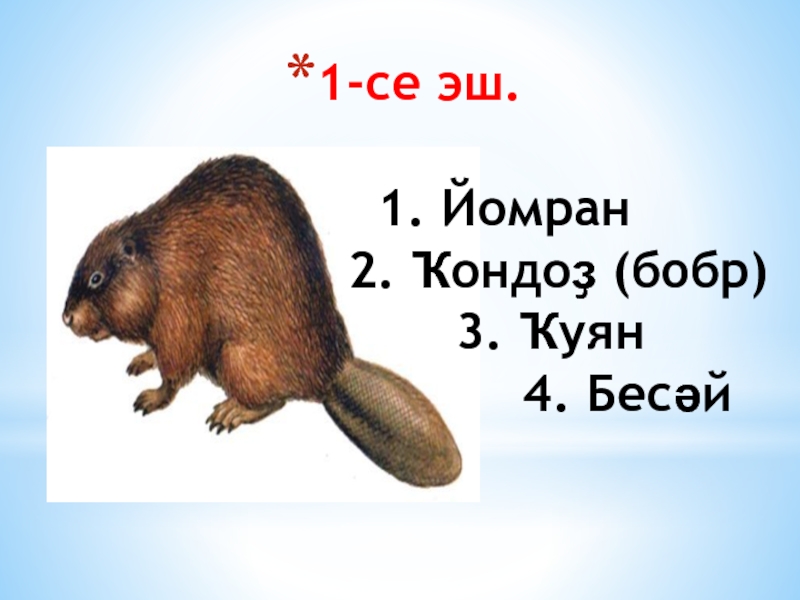 2. Ҡондоҙ (бобр) 3. Ҡуян 4. Бесәй