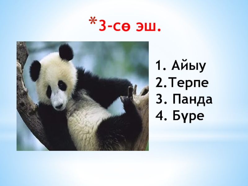 1. Айыу 2.Терпе 3. Панда 4. Бүре