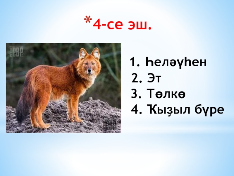 1. Һеләүһен 2. Эт 3. Төлкө 4. Ҡыҙыл бүре