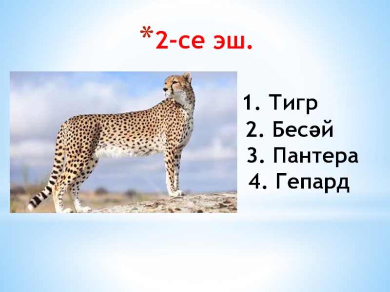 1. Тигр 2. Бесәй 3. Пантера 4. Гепард
