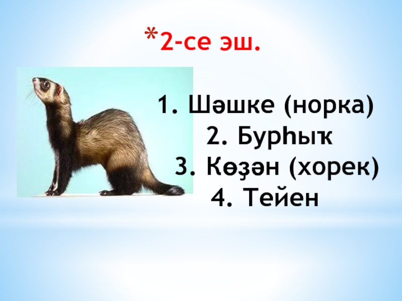 2. Бурһыҡ 3. Көҙән (хорек) 4. Тейен
