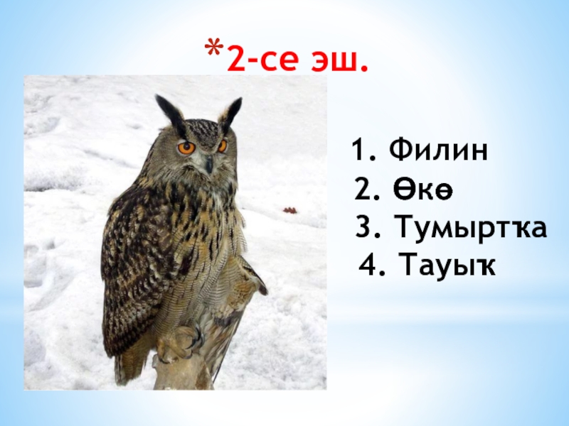 1. Филин 2. Өкө 3. Тумыртҡа 4. Тауыҡ