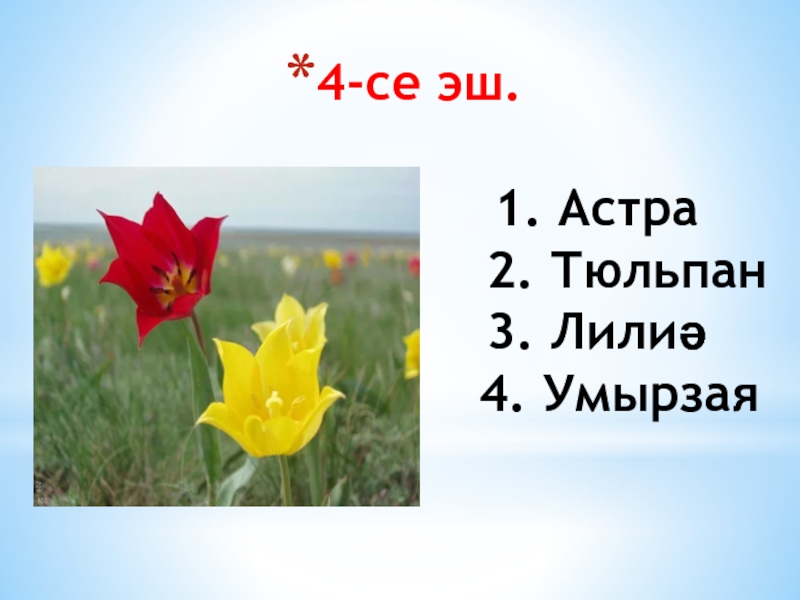 1. Астра 2. Тюльпан 3. Лилиә 4. Умырзая
