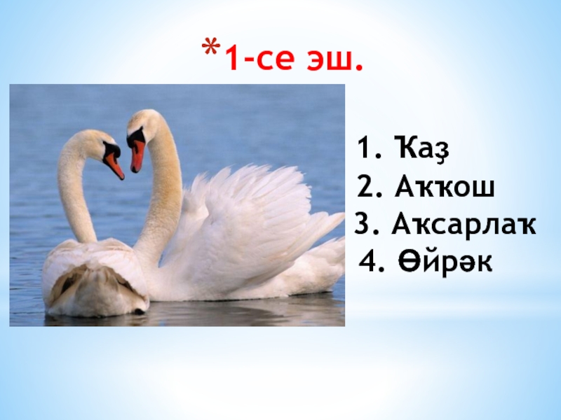 1. Ҡаҙ 2. Аҡҡош 3. Аҡсарлаҡ 4. Өйрәк