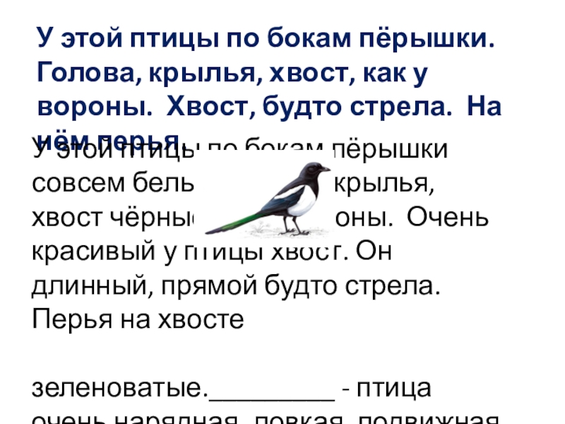 У этой птицы по бокам пёрышки совсем белые. Голова, крылья, хвост чёрные, как у вороны. Очень красивый у птицы хвост. Он длинный, прямой будто стрела. Перья на хвосте